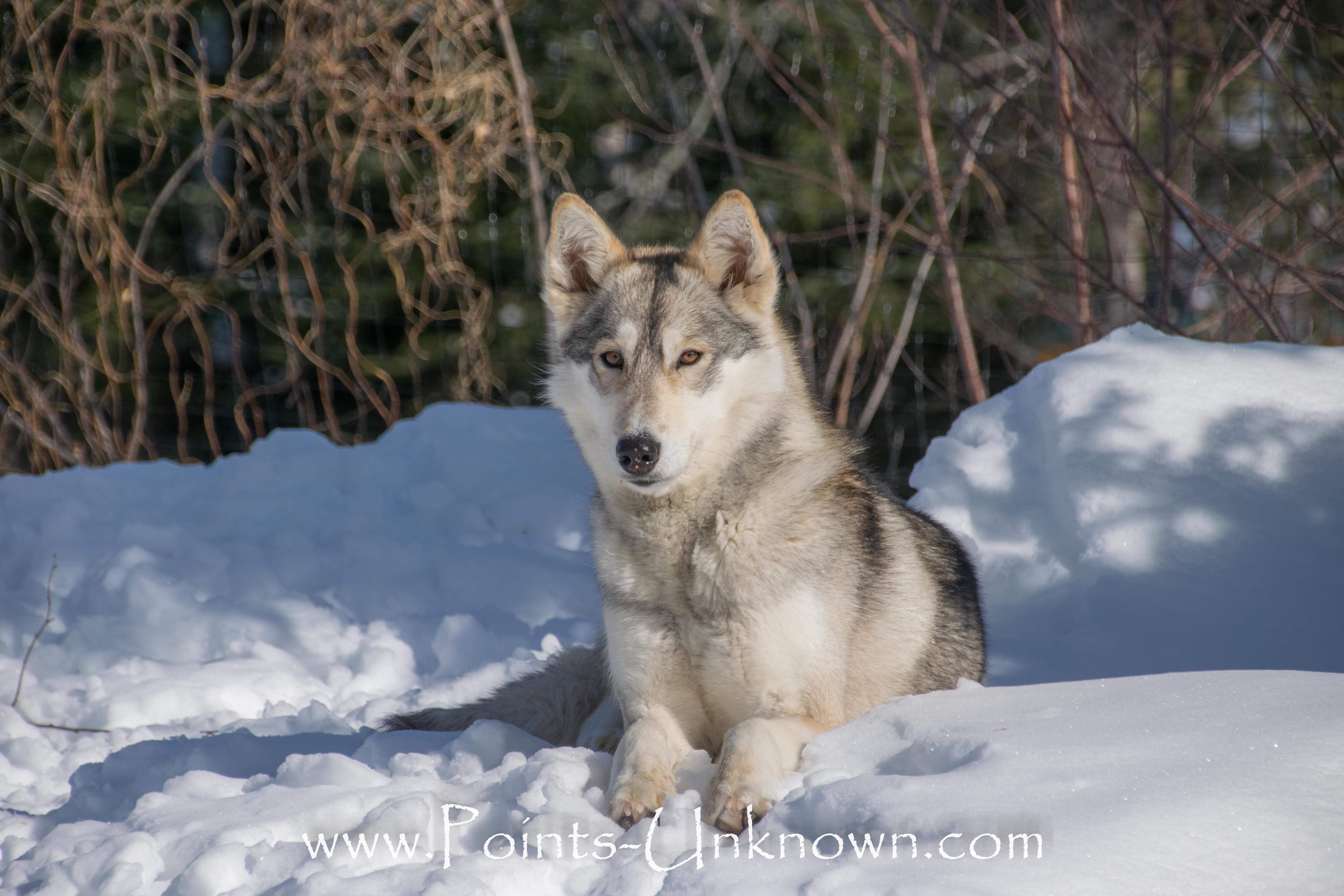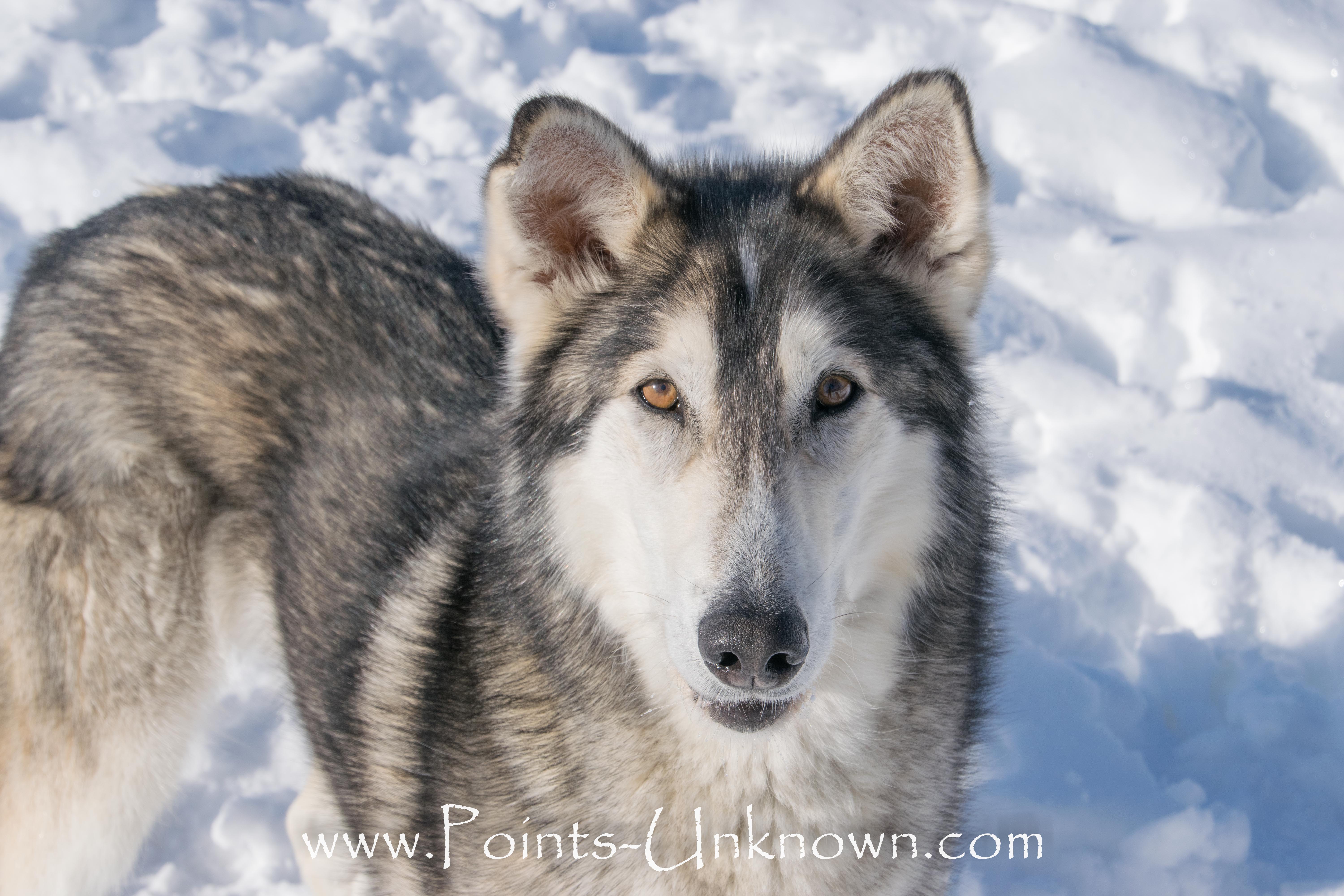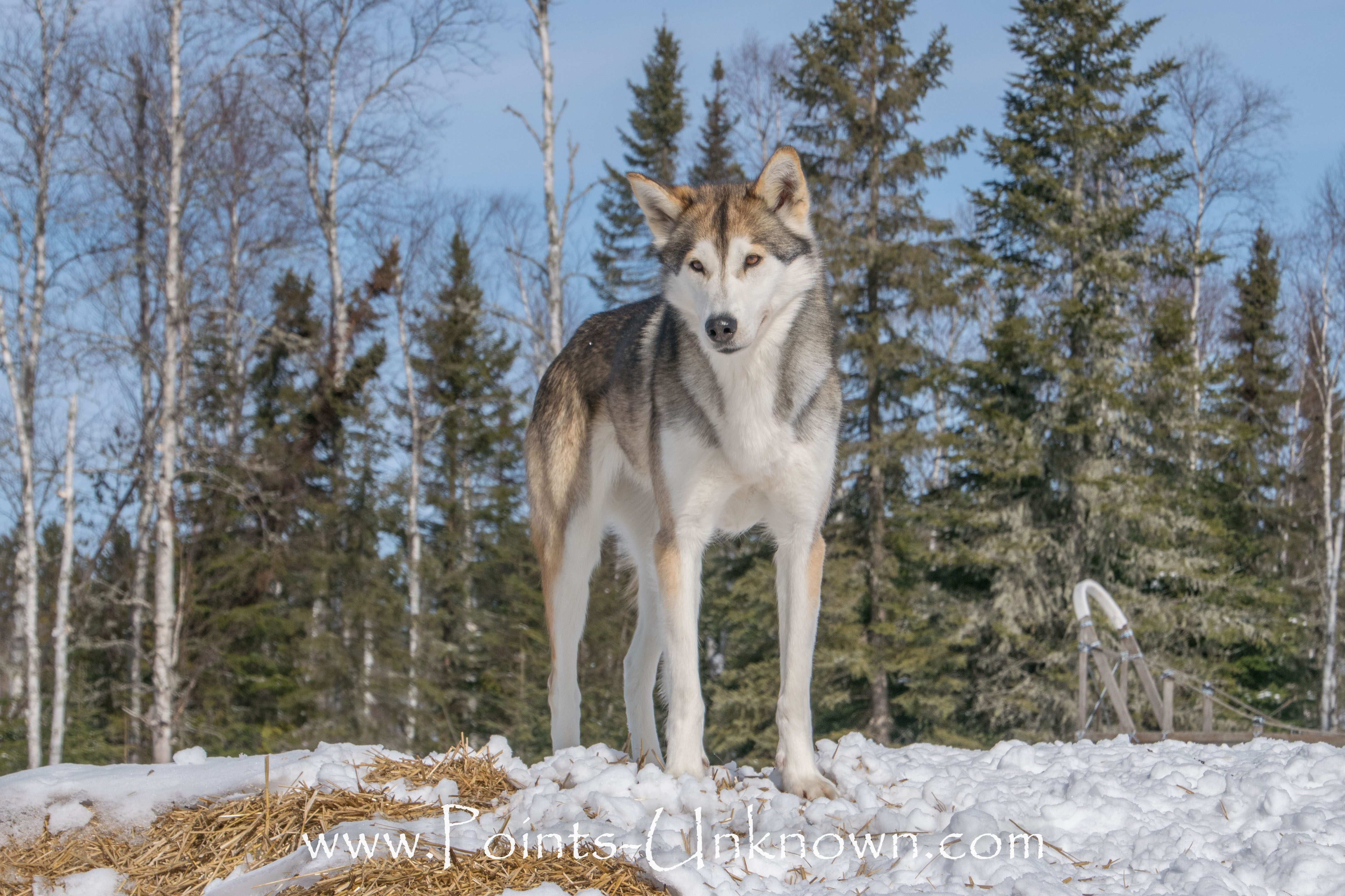 Griffin is out of Points Unknown’s Chetan at Stardancer Historical Freight Dogs and our Phoenix. He and his sister, Terra, are the first ever puppies born through frozen surgical artificial insemination in our Hedlund Husky Preservation Project. Frozen Phoenix was flown to Alaska approximately 63 days prior to their birth and the rest is history! Griffin has many of his father’s amazing qualities with a dash of naughtiness. He’s very laid back and gentle and, even as a puppy, did well with our very young and older guests. Being eager-to-please and extremely focused during our canicross hikes, it’s no mistake that he has become a valued Points Unknown team member who could pull the weight of the sled all by himself.